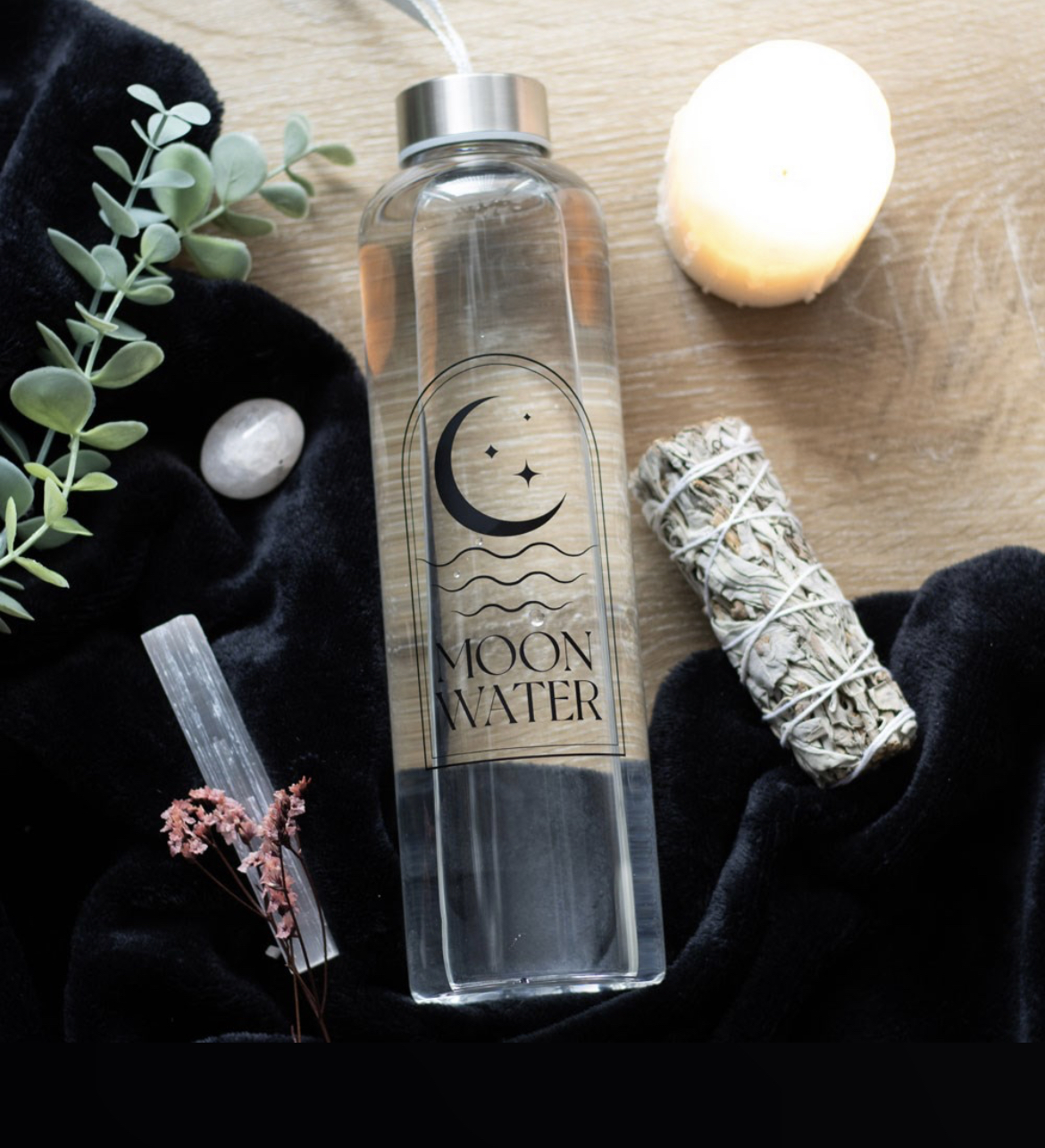 This glass water bottle makes a beautiful vessel for holding water charged under the light of the moon. Simply fill with spring water and place outside or next to a window during a specific moon phase to infuse the water with the moon’s healing energy. This water can then be used to drink, water plants, cleanse the home and amplify spiritual intentions. 550ml capacity.